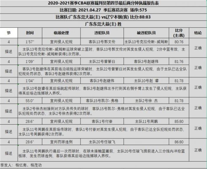 28日,CBA官方给出了裁判报告,本场比赛最后时刻6次判罚全部没有问题,这份回应也可以打响郭艾伦的质疑,威姆斯之所以能够迅速打成2+1,最终的还是他们的专注和执行力,用周鹏的话说:比赛的最终目的是赢球,并不是打一个精彩的球就结束比赛,打进关键进球的郭艾伦真的应该好好学习周鹏这番话。