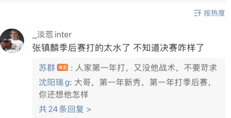 在平台上,有球迷质疑张镇麟季后赛打得太水了,不知道决赛咋样,苏群老师表示,张镇麟第一年打,又没他战术,不要苛求。