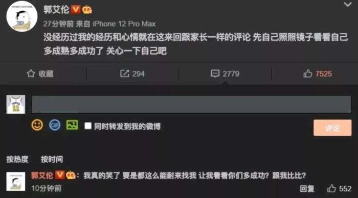 遇到这样的情况,很多球迷已经意识到郭艾伦赛后大概率会更新社交媒体,果然因为被球迷质疑不成熟,郭艾伦在社交媒体开始和球迷互怼。郭艾伦先是用了一番:没经历过我的经历和心情,就在这来回跟家长一样的评论,先照照镜子看看自己多成熟多成功了,关心一下自己吧。