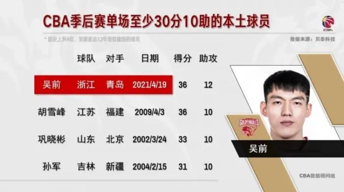全场轰下36分的同时还送出12记助攻,正负值高达+24,开启季后赛模式的吴前成为CBA季后赛史上首位取得该成就的本土球员,还成功比肩多位名宿。