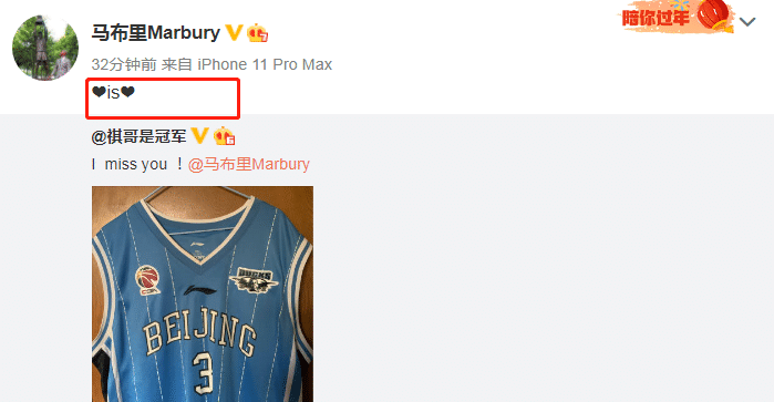 赛后,有球迷晒出了马布里当年身穿北京首钢的3号球衣,并发文称,“I miss you”。而老马也进行了回应,发布了两个心形,中间是字母“is”,笔者猜测,可能马布里也想念那时候的北京首钢,让广东成为背景。