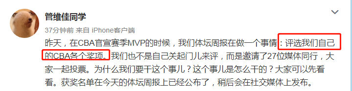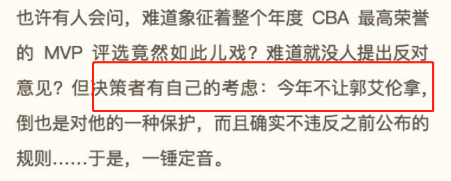 而管维佳在长文中也大爆料:决策者有自己的考虑,今年不让郭艾伦拿,也是对他的一种保护,而且不违反之前公布的规则,于是一锤定音。