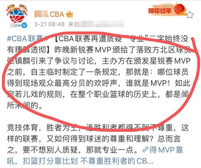 专业,CBA作为一个职业联赛,真的对不起这两个字,何为MVP,在竞技体育中,胜者为王,这是对于胜者最大的褒奖,即便是NBA,即便是乔丹的最后一届全明星,因为东部输球,乔丹都无缘MVP,而CBA竟然为了一个小将让路,这样的做法着实寒了其他球员和球迷的心,或许CBA公司真的应该好好考虑专业这两个字到底该如何书写了。