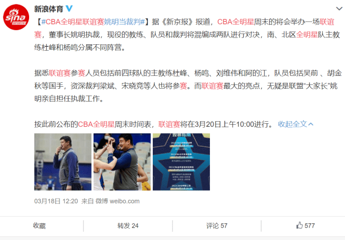 来源:JRS直播网03-19 15:48JRS直播网3月19日讯 ,据国内多家媒体爆料,CBA全明星周末将进行“联谊赛”由裁判、主教练和球员组队,混编进行比赛,担任裁判的是姚明!
