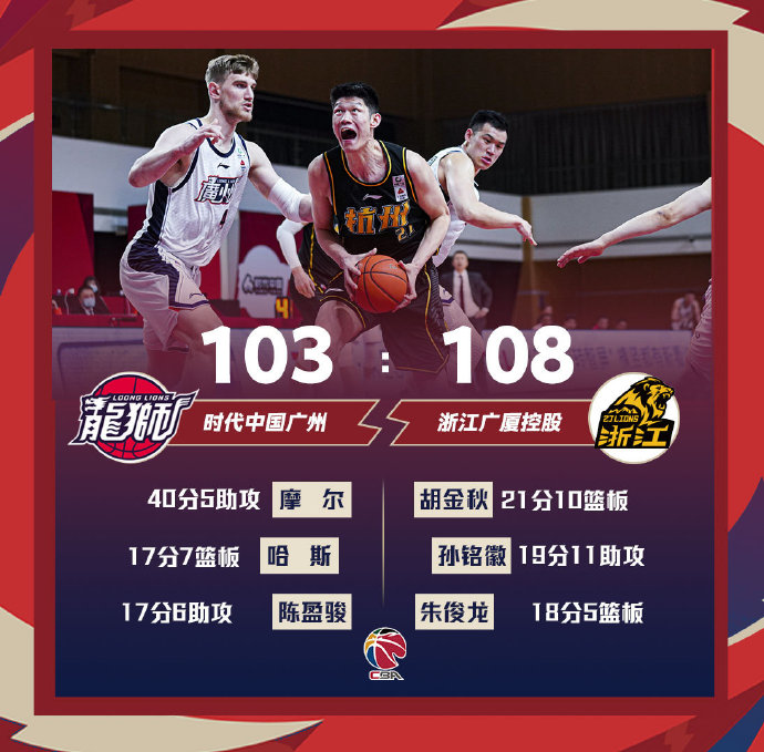 末节,摩尔外线持球突破,直奔篮下打板命中。胡金秋篮下得球,顺势起飞勾手命中。赵宴满中路突破,对抗后跳投得手。祝铭震篮下不中,哈斯抢下进攻篮板,二次进攻得分。孙铭徽持球单打,罚球线顺势抛投得手。最后时刻,广州连续三分不中,冯欣两罚中一,为广厦锁定胜局。全程比赛结束,广州103-108不敌广厦。