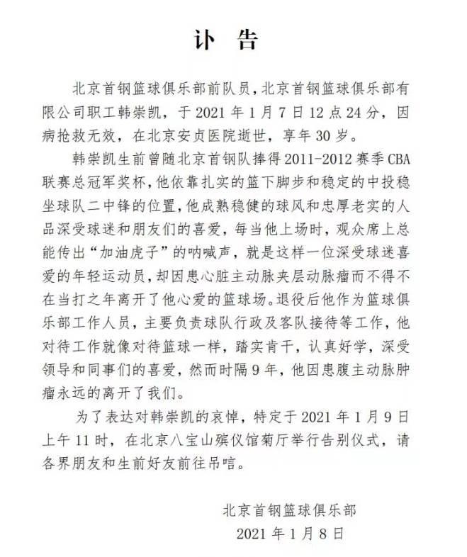 来源:JRS直播网01-08 21:01JRS直播网1月8日讯 北京时间1月8日,篮坛传出了一个不幸的消息,北京男篮前球员韩崇凯因病去世,年仅30岁。随后,北京男篮官方社交媒体发布了讣告。