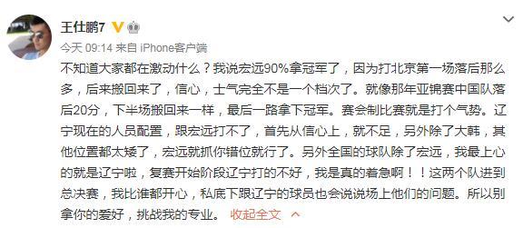 王仕鹏在社媒上写道:“不知道大家都在激动什么?我说宏远90%拿冠军了,因为打北京第一场落后那么多,后来搬回来了,信心,士气完全不是一个档次了。就像那年亚锦赛中国队落后20分,下半场搬回来一样,最后一路拿下冠军。赛会制比赛就是打个气势。辽宁现在的人员配置,跟宏远打不了,首先从信心上,就不足,另外除了大韩,其他位置都太矮了,宏远就抓你错位就行了。另外全国的球队除了宏远,我最上心的就是辽宁啦,复赛开始阶段辽宁打的不好,我是真的着急啊!!这两个队进到总决赛,我比谁都开心,私底下跟辽宁的球员也会说说场上他们的问题。所以别拿你的爱好,挑战我的专业。”