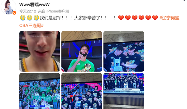 赵继伟的爱人王君瑞在赛后感慨:我们是冠军!!!大家都辛苦了!