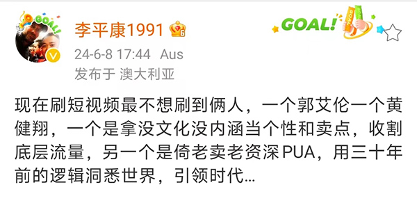 而郭艾伦的言论也是引发了很多争议,近期,全网首个报道李铁被抓的名记李平康也是在社交媒体上开火,李平康表示:最不想刷到的两个人,一个是郭艾伦,一个是黄健翔,一个是拿没文化没内涵当个性和卖点,收割底层流量。一个是倚老卖老。
