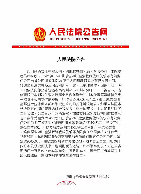 最后,我们再来说说收获喜讯的四川男篮。根据多个媒体人的报道,四川男篮此前主场搬家,房子处理的钱终于拿到手了。据悉,四川男篮当时搬家,他们将房子卖给了两家公司,不过之后这个钱是一直没有到位,这也让双方对簿公堂。