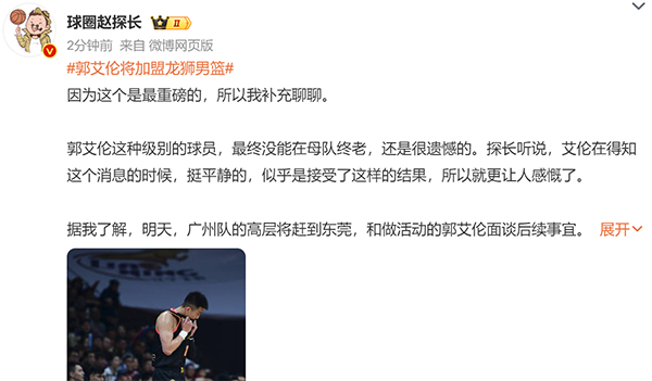 值得一提的是,今天的郭艾伦还在东莞进行网络直播,结果晚上就加盟到广州男篮,职业生涯首度离开辽宁男篮。辽篮卖出功勋,毕竟上个赛季没有郭艾伦的辽篮也拿下总冠军,球员郭艾伦虽然是14年的功勋,但也仅被通知,广州商讨加盟,这也让不少球迷吐槽辽篮的行为,是没有人情味的,没有让郭艾伦“终老”辽宁男篮。
