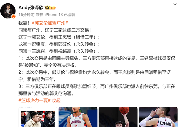 来源:JRS直播网08-25 15:51JRS直播网讯 北京时间8月24日,周琦没有和广东男篮续约,加盟到北京男篮。如今重磅的交易又来了,郭艾伦加盟广州 ,首度离开辽宁男篮,这是根据贾磊的报道显示,辽宁、广州、同曦达成三方交易,郭艾伦的签约权被交易至广州、王岚嵚续约后租借至辽宁三年、祝铭震永久转会至南京同曦 。