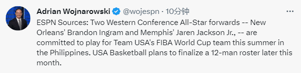 来源:JRS直播网06-06 10:40JRS直播网06月06日,据ESPN名记woj报道,英格拉姆和小贾伦-杰克逊承诺为美国队出战今夏的男篮世界杯,到目前位置,美国男篮12人名单已经确定8席,美国队将在本月晚些时候正式公布12人大名单。