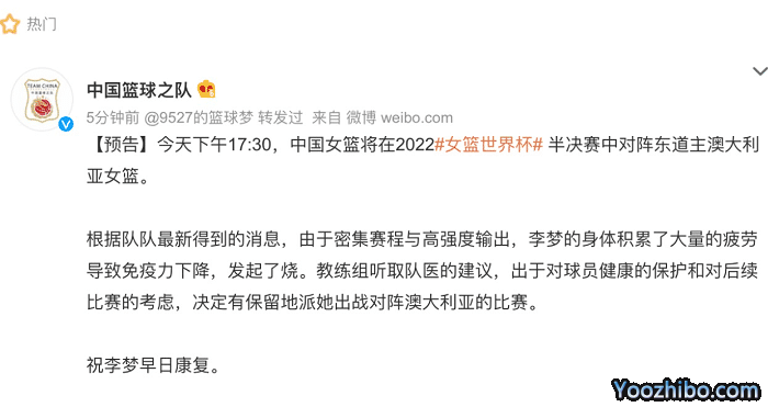 “昨天结束比赛时,李梦就与我们联系,说在比赛中发烧了,非常难受。截止到今早李梦还未能有所好转。希望梦梦能赶紧好起来,也希望中国女篮今天取得一场至关重要的胜利!”