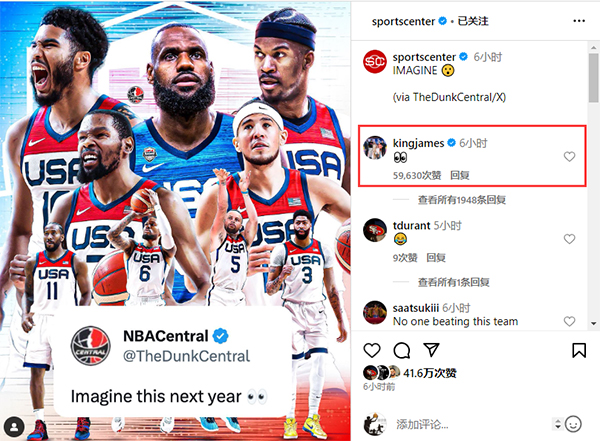 美媒SportsCenter转发并配文表示畅想,詹姆斯本人在评论区回复“眼睛”,言外之意就是他看到了;值得一提的是,杜兰特的哥哥回复了一个笑哭的表情。