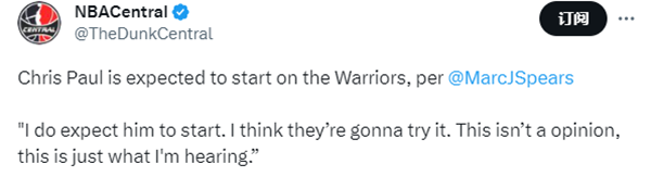 ESPN记者Marc Spears再次表示,克里斯-保罗预计会在勇士打首发,Spears表示:预计他会打首发,我估计上场时间分切成5分钟。我不清楚他们是否真的想让他打很长时间,预计他会首发不是我的观点,这是我听到的消息。他职业生涯从来没有打过替补。
