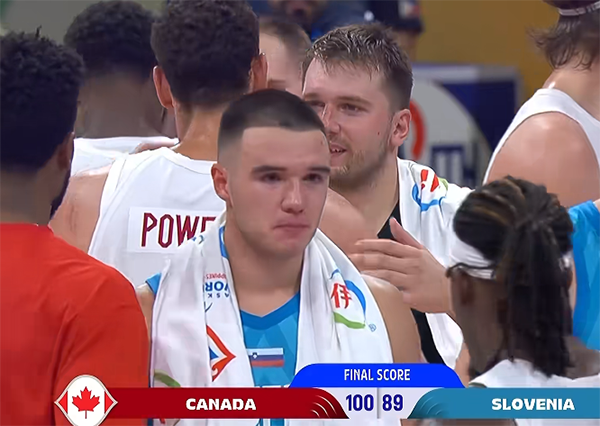 被驱逐后东契奇调整情绪,之后他披着毛巾站在球员通道处观看斯洛文尼亚剩余的比赛,背影中透露出无奈、落寞和不甘心,不过赛后东契奇仍旧大度走上球场,并且拥抱鲍威尔等加拿大球员。