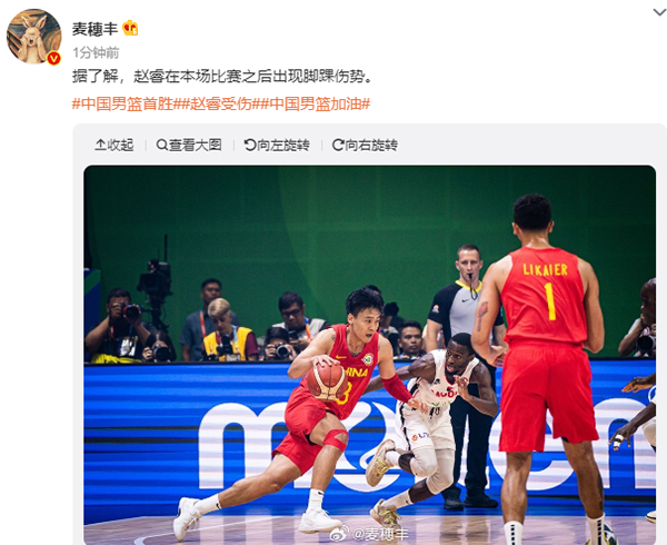 媒体人麦穗丰赛后报道,据了解,乔帅赛后透露,赵睿在本场比赛之后出现脚踝伤势;今日一战,赵睿首发出战28分钟,1中1贡献5分6助攻2篮板1抢断,为了冲击奥运门票,赵睿真是太拼了,希望他的脚踝无大碍。