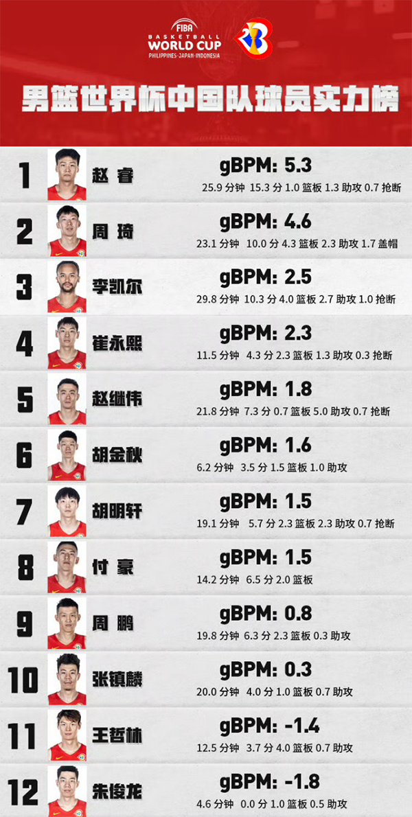 崔永熙第四,赵继伟第五,他的5次助攻是中国男篮最高的。胡金秋、胡明轩、付豪、周鹏和张镇麟排名第6-10位,其中胡明轩在小组赛第三场顶替李凯尔首发出战,他在小组赛场均得到5.7分。王哲林第11名,机会比较少的朱俊龙垫底。