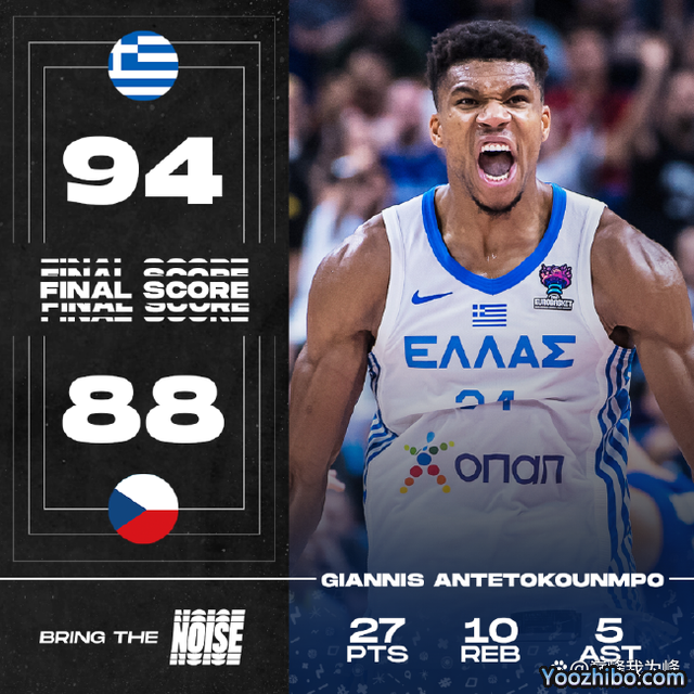 JRS直播网讯:北京时间9月12日凌晨,男篮欧锦赛16进8的比赛,希腊队迎战捷克队,希腊队首节一度领先10分,捷克队追平,双方此后拉锯,第四节希腊队在字母哥带领下再次建立10分优势,最终希腊队94-88战胜了捷克队,晋级八强。