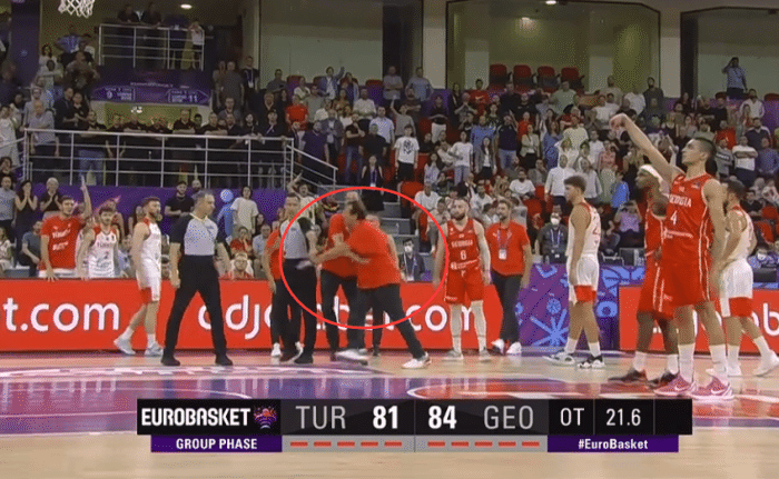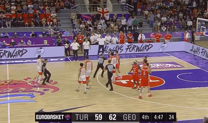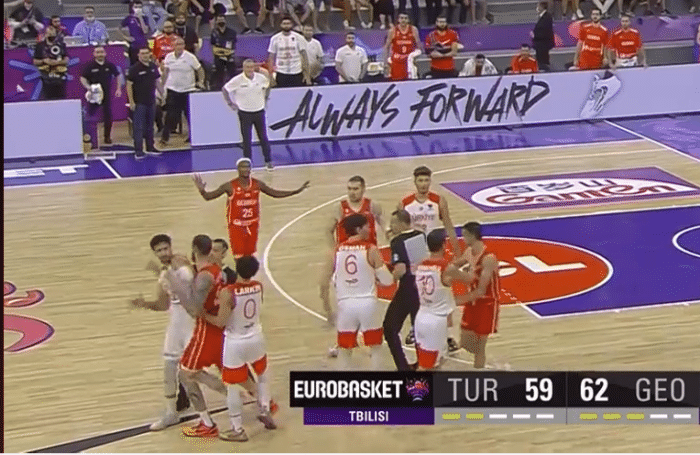 裁判吹停了比赛,慢镜头回放显示,两人开始先是互喷垃圾话,随后发生冲突,在经过长时间的录像回放,裁判给出了吹罚,科克马兹被驱逐出场,萨纳泽被驱逐出场。加时赛的比赛还剩下21.6秒的时候,裁判响哨吹罚犯规,最终经过录像回放,裁判吹罚了土耳其球员违体犯规,土耳其主帅不满裁判吹罚,情绪失控被直接驱逐出场。