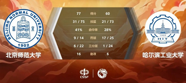 JRS直播网讯3月12日 CUBAL东北赛区小组赛,北京师范大学对阵哈尔滨工业大学。首场小组赛,两队皆获胜。比赛开始,吴士广篮下先拿2分为北京师大开局,哈工大开局很是慢热被北京师大打出9-0开局。打了3分钟杨淳君终于为哈工大开局,周鑫也连续得分,但吴士广补篮回应,肖洋三分开和后北京师大领先到双位数。周鑫三分再止血,吴士广继续二次进攻打成,首节北京师大26-12领先哈工大。次节上来,哈工大进攻端还是不在状态,北京师大顺势扩大领先。辛泽林造杀伤终于打破僵局,但两队进攻端命中率都不高,场上频频打铁。随后高梓淇接连三分命中帮助北京师大稳住领先优势,杨淳君连续前场篮板终于打成二次进攻拿到运动战进球得分,半场北京师大43-26继续领先哈工大。易边再战,双方连续几回合尝试三分但都没有命中,打了3分多钟各自仅得2分。杨淳君冲击造杀伤、强打2+1带队追分,北京师大及时调整,邵振恒站出来连续抢到前场篮板,里突外投三分也开和砍下7分强势回应。哈工大还是依靠拼抢前场篮板获得进攻机会,连续罚球追分,但三节北京师大57-46还领先哈工大11分。末节决战,双方上来又是连续打铁,邵振恒连攻加传帮助北京师大牢牢掌握住十几分领先。江龙接连打成二次进攻止血,但肖洋三分被犯规后三罚全中再回应,随后肖洋里突外投再连得6分杀死比赛,最终北京师大77-60战胜哈工大。