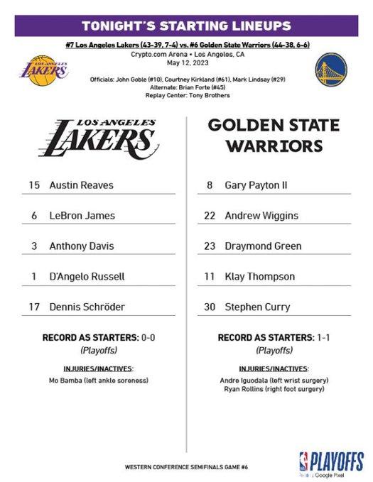 来源:JRS直播网05-13 09:49JRS直播网05月13日,NBA季后赛湖人和勇士G6关键战来了,两队首发正式出炉,维金斯带伤出战,勇士继续使用死亡五小首发;湖人变阵,施罗德顶替范德比尔特进入首发,哈姆终于变阵了,浓眉免遭脑震荡,继续带伤出战。