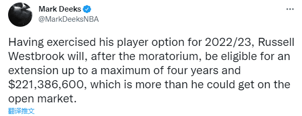 来源:JRS直播网06-30 11:11JRS直播网06月30日讯 ,据NBA分析师Mark Deeks报道,在执行下赛季球员选项后,威少将有资格与湖人签下4年2.21亿美元的顶薪提前续约合同,这比他在自由市场上能获得的合同更大;威少该合同最后一年的年薪将达到6127万美元,但是考虑到届时工资帽也将上涨,这份年薪的大小暂时无法衡量。