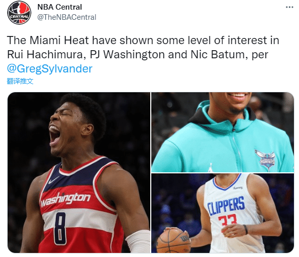NBA记者Greg Sylvander报道,热火有意奇才球员八村塁、黄蜂球员PJ-华盛顿和快船球员巴图姆;目前黄蜂正在兜售华盛顿,而奇才超市早已开张,除了比尔,其他所有球员都可以被交易;本赛季巴图姆场均9.1分4.5篮板1.6助攻,八村塁场均7.5分3.7篮板,本赛季到目前仅打14场。