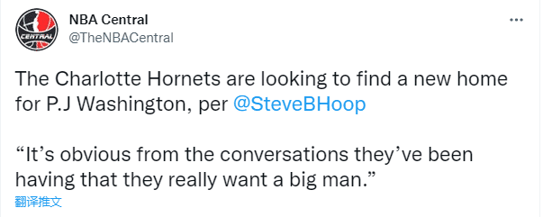 据美媒NBA Central报道,黄蜂正在为PJ-华盛顿寻找新的东家,黄蜂想要引援一名大个子球员。