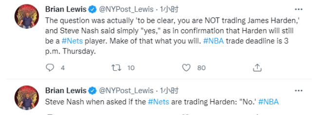 篮网和掘金对阵赛前,纳什回应关于哈登的交易流言,直言:篮网不会交易哈登;纳什还表示外界的交易流言都是76人制造的,他已经和哈登谈过,哈登想要留在篮网,而篮网也想哈登留下。