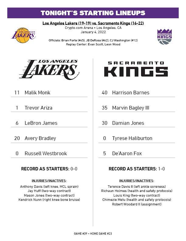 过去4场比赛,詹姆斯、威少、蒙克和布拉德利是固定的四名首发球员,斯坦利-约翰逊首发三次,对阵灰熊时霍华德首发;如今约翰逊已经离开球队,湖人对阵国王继续使用五小首发阵容,阿里扎顶替约翰逊首发,全队身穿金色战袍出战。