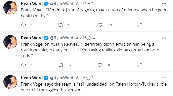 湖人关键球员纳恩已经无限接近复出,今天赛前他进行了投篮训练,沃帅表示当纳恩复出时,他将会获得很多的上场时间;沃帅还称赞了里夫斯在攻防两端的表现,不过对于霍顿-塔克在球队中扮演的具体角色,沃帅还没有做出最终的决定。