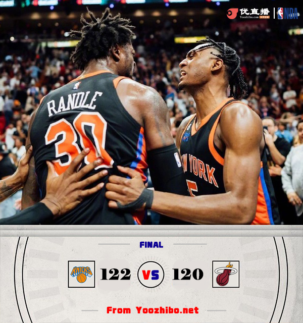 JRS直播网3月4日讯 NBA常规赛激战正酣,尼克斯和热火正面对话,尼克斯近期豪取七连胜,目前以37胜27负暂列东部第5位,热火上场输球后战绩更新为33胜30负,目前排在东部第7位。此役一上来双方你来我往比分紧咬,兰德尔飚中4记三分单节狂轰20分,巴特勒和希罗短暂回应,但尼克斯火力全开单节斩获37分,首节结束时尼克斯领先6分,次节回来,奎克利突然发力单节贡献10分,尼克斯稳扎稳打继续扩大优势,半场战罢,尼克斯71-56牢牢占优。下半场回来,阿德巴约和希罗内外结合,两人联手率队不断缩小分差,末段尼克斯及时回应稳住局势,三节结束后尼克斯依然领先8分,末节上来,尼克斯进攻再度停滞,热火打出9-0小高潮一度反超,决胜时刻兰德尔跳投打成2+1,希罗连得4分再次反超,无奈兰德尔上演极限三分准绝杀,最终尼克斯险胜对手。