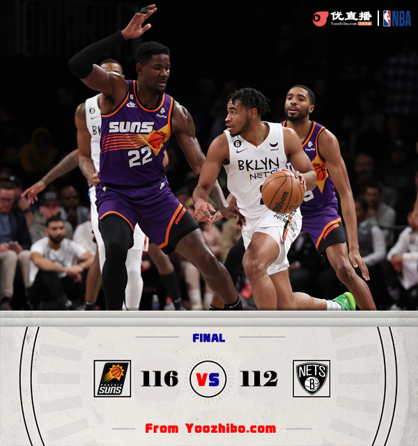 JRS直播网2月8日讯 NBA常规赛继续进行,篮网主场迎战太阳,篮网刚刚交易走欧文,迎来丁威迪和芬尼-史密斯,但本场教练决定两人不上场,渡边雄太和小库里也不打,但西蒙斯缺席5场后复出;而因腹股沟伤势缺席21场的布克本场也终于迎来复出。上半场属于布克和托马斯的对攻战,布克复出状态十分不错,里突外投连续得分,而艾顿次节也是连续吃饼单节得分上双,而篮网进攻端主要靠托马斯撑起,他继续延续火热状态半场再砍下24分,双方比分始终拉不开,太阳得分点更多取得微弱领先。下半场,布里奇斯找到手感里突外投连砍8分帮助太阳拉开双位数分差,但托马斯马上带领篮网回应一波12-0攻击波,随后双方展开拉锯战,太阳依靠替补不错发挥再次拉开双位数领先,但篮网连续外线发炮再次10-0咬住比分,关键时刻布克两罚全不中,但“点球”大战篮网没有暂停非常致命,艾顿两罚全中杀死比赛,最终太阳险胜篮网,取得3连胜。