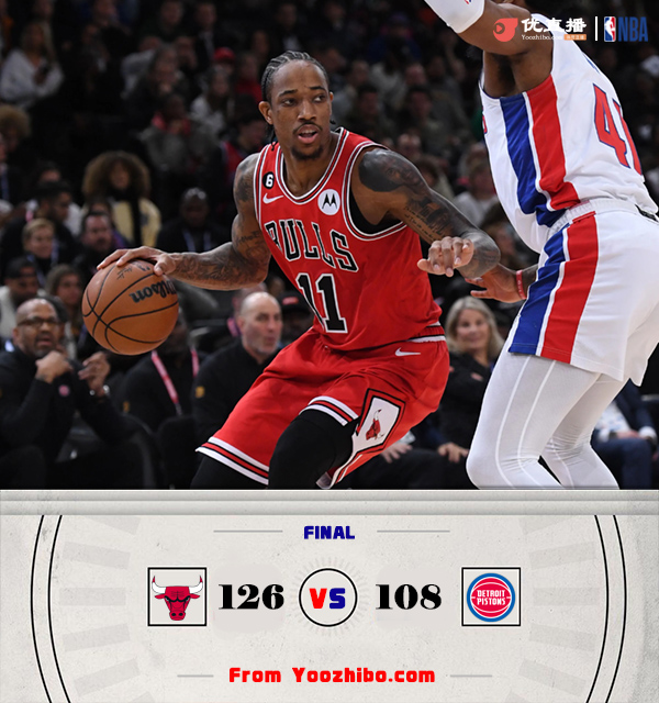 JRS直播网1月20日讯 NBA常规赛,公牛客场挑战活塞。公牛东部第十,活塞东部垫底。上半场,公牛率先发力取得9-2的开局,活塞很快进入状态内外开花迫近比分,公牛持续发力,轮番冲击篮筐频频得手将分差拉开到两位数,此后双方展开拉锯战,半场战罢公牛65-56领先。下半场,双方围绕10分左右的分差展开激烈争夺,活塞命中率下降,公牛一度将优势扩大到18分,活塞奋力反击将分差缩小到个位数,但公牛多点开花将分差拉开到20分杀死比赛。最终,公牛126-108击败活塞,客场过关。