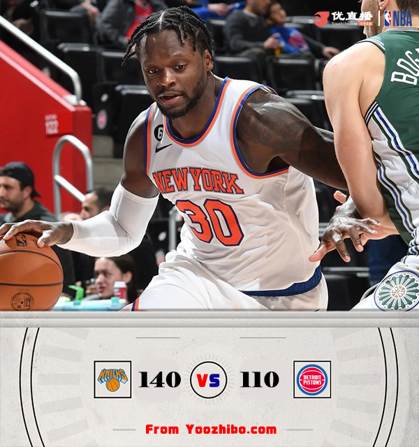 JRS直播网11月30日讯 NBA常规赛继续进行,活塞主场迎战尼克斯,本赛季两队状态都不好,目前都经历了两连败,尼克斯9胜11负排在东部第12,而活塞则是5胜17负东部垫底。比赛开始,尼克斯进攻端迅速进入状态,作为联盟三分球最差的球队,尼克斯却一改常态在半场就轰进11记三分,而兰德尔更是状态火热,半场扔进6记三分怒砍26分帮助尼克斯建立双位数领先,活塞由于伤病只能靠博扬和巴格利一内一外勉强回应,随后尼克斯进攻端越打越好,第三节打出38-21的单节比分直接领先到30分以上,比赛彻底失去悬念,最终尼克斯140-110大胜活塞,终止连败的同时送对手3连败。