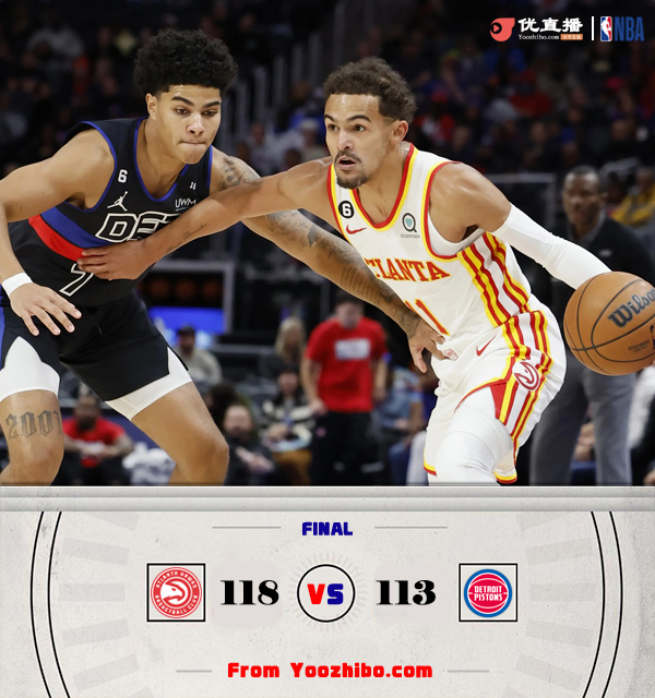 JRS直播网讯10月27日讯 NBA常规赛老鹰对阵活塞,老鹰上场比赛不敌黄蜂遭遇赛季首败,活塞则是最近遭遇3连败。上半场老鹰靠着亨特和特雷-杨两人的发挥取得领先,康宁汉姆状态不错联手博格达诺维奇努力追分,第二节老鹰手感有所下降,活塞在康宁汉姆的带领下迫近比分,上半场老鹰只领先1分。下半场回来活塞一度完成反超,但老鹰及时调整在特雷-杨的带领下夺回领先,最终老鹰118-113力克活塞。