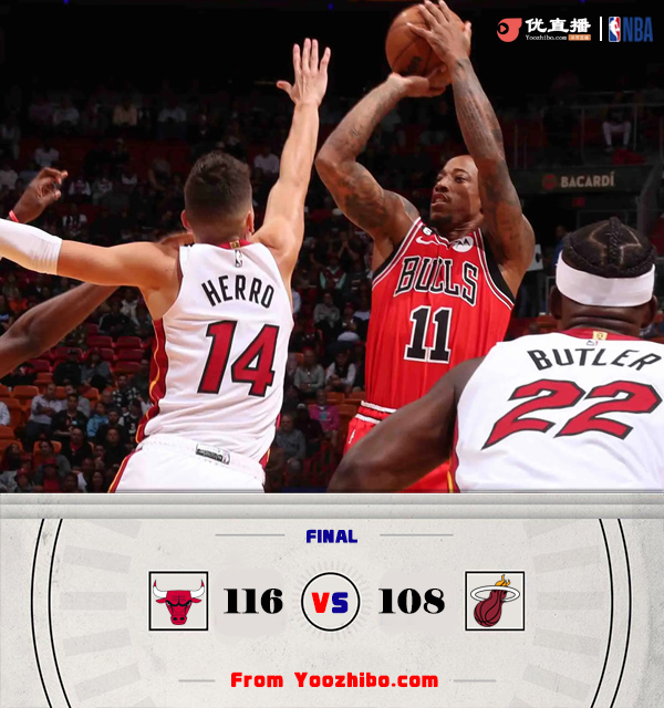 JRS直播网10月20日讯 热火今日坐镇主场迎战自己新赛季的首个对手公牛,热火方面除了受困肌腱炎的奥拉迪波外核心阵容基本全员可以出战;公牛这边则连续遭到打击,除了鲍尔以外,拉文因为膝盖问题也缺席了本场比赛。热火在面对阵容不整的公牛只打了一节好球,公牛虽然缺少了拉文和鲍尔等核心主力,但以德拉季奇和道苏姆为首的他们在第二节轰进7记三分改写开局不利局面。下半场成为德罗赞的表演时间,第三节他疯狂砍下19分,第四节也有9分入账帮助公牛守住胜利。最终,公牛客场扑灭热火迎来开门红。