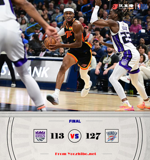 JRS直播网讯 2月12日 NBA常规赛,雷霆主场迎战国王,雷霆目前2连败后35胜17负排在西部第4位,国王则是30胜21负排在西部第5位。比赛开始,双方上来都迅速进入状态,小萨博尼斯继续有攻有传撑起球队进攻,蒙克替补上来状态上佳,而亚历山大则是状态火热单节砍下15分,首节雷霆领先15分,次节杰伦-威廉姆斯上来连续突内线砍下10分,雷霆顺势打出10-2进攻波一举拉开比分,随后双方围绕双位数分差展开拉锯战,半场雷霆领先10分。下半场,小萨里突外投连续追分后国王突然断电,雷霆众将多点开花,里突外投打出16-0超级攻击波一举拉开20分以上领先,又是蒙克连续远投止血,三节结束雷霆领先17分,末节国王上来下起三分雨一波14-5直接追至个位数分差,杰伦-威廉姆斯站出来连续中远投止血,亚历山大也是接连中远投稳住局势,雷霆牢牢守住双位数领先,最终雷霆127-113力克国王。