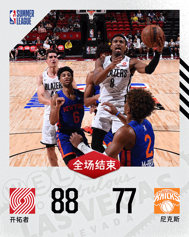 JRS直播网7月12日讯 拉斯维加斯夏季联赛继续开打,开拓者和尼克斯迎来一场交手。首节对决开拓者完全不在状态单节仅得9分,而尼克斯这边早早进入状态迎来13-0的完美开局,这波进攻也帮助他们在首节拿到15分领先;然而次节轮到尼克斯熄火,开拓者开局不久送出19-4的攻势追上比分,末段又抓住对手罚球不中的机会实现弯道超车反超1分进入下半场。第三节双方争夺主动权都拿到过领先,不过最后时刻开拓者以一波10-0的攻势夺回领先进入末节决战,第四节争夺开拓者在拉锯战中笑到最后,他们节中连续开火将优势扩大至两位数奠定胜局。最终,开拓者击败尼克斯拿下比赛,而尼克斯没能延续自己夏联的不败金身。