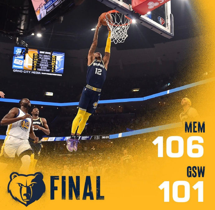 JRS直播网5月4日讯 灰熊今日继续坐镇主场迎来和勇士系列赛的G2之争,首战勇士1分险胜灰熊先拔头筹。首节之争灰熊开局非常积极连续制造对手失误并取得8-0的开局,也许是过度兴奋,狄龙随后防守端击打佩顿头部被吹罚二级恶意犯规直接驱逐,不过面对勇士的回暖反扑,莫兰特和小杰克逊首节合力攻下24分占据上风;次节灰熊状态大幅下滑,前6分钟仅得6分的表现相当糟糕,奈何勇士自己也没能抓住机会,即便后半节找回感觉但也错过最佳良机,莫兰特末段连拿7分为灰熊守住5分优势。第三节灰熊一度重新取得两位数领先,但勇士总能关键时刻拿分,末段一波13-3的攻势抹平比分进入末节决战,而末节也如预期那般僵持,库里和莫兰特的对决十足精彩,但莫兰特成为这波对决的胜者,他在最后时不足5分钟的时间里砍下15分帮助灰熊反超比分奠定胜局。最终,灰熊主场力克勇士扳回一城,总比分1-1打平。
