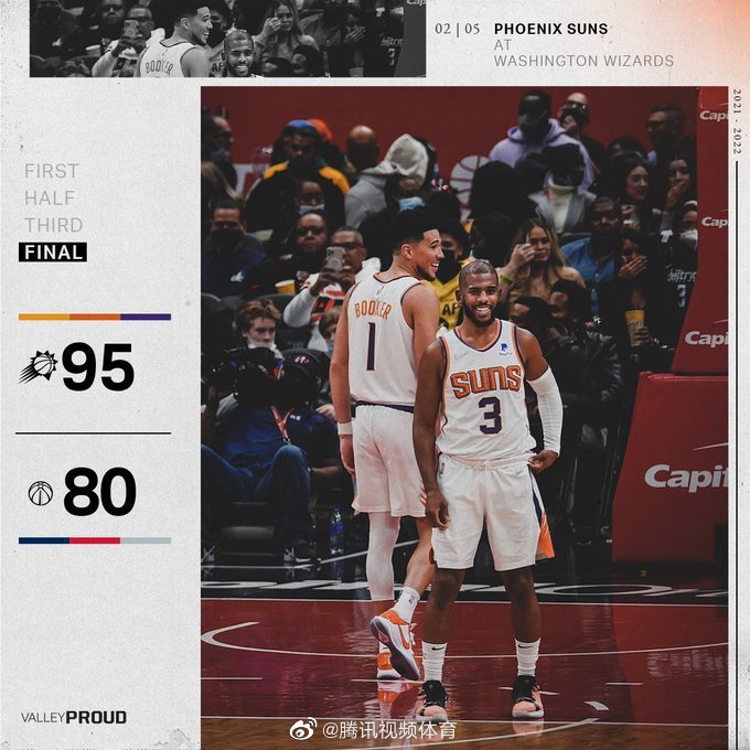 JRS直播网2月6日讯 NBA常规赛,太阳客场挑战奇才。太阳刚刚不敌老鹰,连胜虽然遭到终结,仍旧稳居联盟榜首。奇才力克76人止住连败,目前排在东部倒数第五。比尔本场继续缺阵。一开场,奇才率先发力8-2领先,此后太阳大举反击,连续打出进攻高潮,领先12分结束首节。第二节,奇才半节时间仅拿到2分,太阳完成15-0的攻击波扩大优势,半场战罢太阳59-32领先27分。下半场,太阳轻松将分差拉开到30分以上,奇才苦苦支撑,三节打完太阳握有34分领先。第四节,过大的分差让比赛早早失去悬念,双方换上替补耗完垃圾时间。最终,太阳大胜奇才,客场过关。