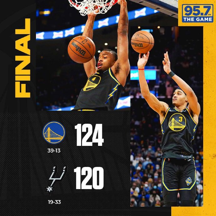 勇士(39-13):普尔31分6篮板5助攻、达米恩-李21分5篮板2助攻2抢断、库明加19分3篮板3助攻、穆迪20分7篮板、安德森6分3篮板7助攻、卢尼12分12篮板3助攻、切奥扎9分3篮板5助攻、威瑟斯庞6分4篮板