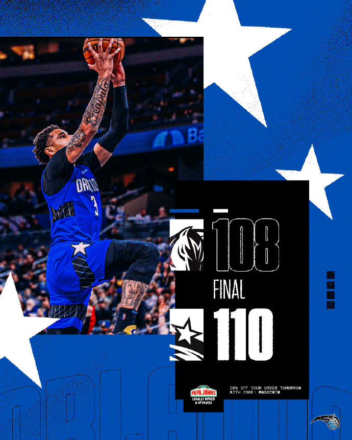 魔术(11-40):奥基基19分5篮板4助攻3抢断、小卡特14分14篮板、小瓦格纳18分3助攻2篮板、小安东尼16分6助攻4篮板、大瓦格纳14分4篮板2助攻、班巴10分7篮板、萨格斯5分5助攻2抢断、小罗斯4分4助攻2篮板