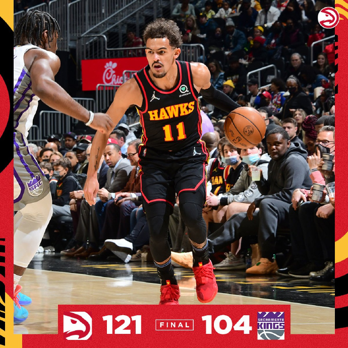 JRS直播网1月27日讯 NBA常规赛继续进行,老鹰坐镇主场迎战国王,此前老鹰获得四连胜,国王则在遭遇四连败,此役福克斯等人缺阵。比赛上来米切尔手感火热,四投四中帮助国王建立领先优势,老鹰这边则手感不佳,分差很快被拉大到两位数,首节结束国王33-21暂时领先。次节回来,奥孔武连续在篮下暴扣取分,博格丹手感火热,外线连续命中帮助老鹰追平并反超比分,米切尔和巴恩斯连中三分止血,但本节最后三分钟国王没有再得分,老鹰这边则是愈战愈勇,特雷-杨准压哨超远三分命中后,老鹰单节46-17净胜29分,半场结束67-50领先。易边再战,老鹰这边延续手感,分差很快被进一步拉大,特雷-杨超远三分飙中后,分差一度来到30分,随后国王状态回暖,打出一波13-2缩小分差,三节结束老鹰94-74领先。末节特雷-杨等老鹰主力没有再上场,两队交替取分,国王每次缩小比分,老鹰总能作出回应,最终老鹰主场121-104大胜国王,取得五连胜的同时送给对方五连败。