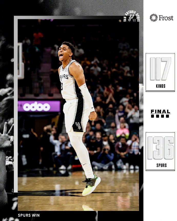 JRS直播网 11月11日讯 NBA常规赛,马刺主场迎战国王,首节马刺快速进入比赛状态,凯尔登、穆雷、瓦塞尔多点开花,在取得7-0开局之后他们又打出20-4的进攻狂潮彻底拉开比分,次节马刺乘胜追击一度领先22分,此时国王依靠福克斯等人的出色发挥打出一波10-1稍稍缩小分差,无奈沃克和穆雷末段再中三记三分,马刺在半场结束时取得了17分的优势。第三节福克斯连得8分率队用一波10-1迫近比分,但马刺很快三军用命重新掌控比赛局势,麦克德莫特、瓦塞尔、赛迪斯-杨们各个争先让国王是防不胜防,末节国王外线手感依旧冰凉,纵使福克斯连投连中也没能组织起有效的反击,马刺一路稳扎稳打收下比赛。最终,马刺136-117战胜国王。