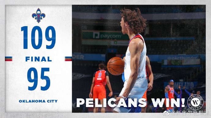 JRS直播网讯 4月30日讯 NBA常规赛,雷霆坐镇主场迎战鹈鹕。爆冷击败凯尔特人后,雷霆结束了自己的14连败,目前仍是位居西部倒数第三。而鹈鹕本赛季并未达到人们的预期,目前只是排在西部第十一位,季后赛的附加赛资格也是越来越远。一开场,两队比分紧咬,鹈鹕突然发力打出进攻高潮,首节结束时领先11分。次节比赛,雷霆先打出11-2完成反超,鹈鹕又还了一波19-3重夺领先,半场打完鹈鹕60-43领先17分。易边再战,雷霆不断发力缩小分差,鹈鹕命中率下滑,但三节结束时依然带着11分的领先优势。鹈鹕续上火力一举把分差拉开到20分,多特连得8分但雷霆无力回天。最终,鹈鹕战胜雷霆,客场带走胜利。