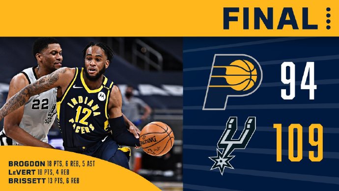 步行者(26-31):勒韦尔18分4篮板2助攻、布罗格登18分6篮板5助攻、萨姆纳7分5篮板6助攻2抢断、布里塞特13分6篮板、比塔泽7分9篮板5盖帽、贾斯丁-霍乐迪4分5篮板、麦康纳8分5篮板4助攻、麦克德莫特4分3篮板、阿隆-霍乐迪6分