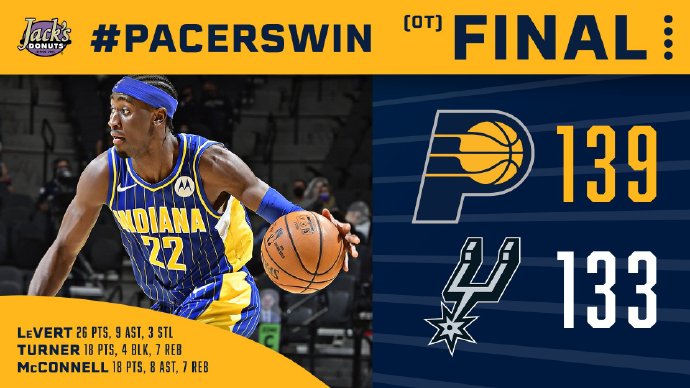 JRS直播网4月4日讯 NBA常规赛马刺主场迎战步行者,马刺上一场刚刚遭遇败仗,步行者则已经是三连败,此役布罗格登和萨博尼斯缺阵。首节两队陷入拉锯战,马刺主打投篮,步行者则错位追打珀尔特尔,德罗赞和勒韦尔作为双方主攻点状态俱佳。步行者连续失误导致马刺将分差拉大到十分,但很快步行者打出10-0追平,首节马刺33-32领先一分。次节两队外线手感升温,进入对攻,麦康纳和霍勒迪连续强突使球队逐渐获得优势,节末米尔斯连得五分帮助球队追分,但勒韦尔也连得五分重新拿回优势,步行者67-59领先。易边再战,场上风云突变,马刺连续打成,一波13-5很快抹平分差,随后德罗赞连取八分,带领马刺众人发力,将领先优势扩大到两位数,调整过后,步行者开始追分,霍勒迪和马丁连中三分,本节结束前比塔则反击造杀伤将比分再次反超,步行者98-97领先。末节开战步行者延续进攻势头,逐渐掌控优势,此后两队交替得分,分差维持在六分上下无法迫近,最后两分钟盖伊站出来连续取分蚕食分差,德罗赞两罚中一后比分追平,特纳和德罗赞绝杀都不中,进入加时。加时赛开场两队交替取分,麦康纳站出来,作为主攻点连取六分,帮助球队获得领先优势,特纳关键时刻篮下切掉德罗赞,马刺无力再抹平分差,步行者以139-133客场取胜,终结三连败。